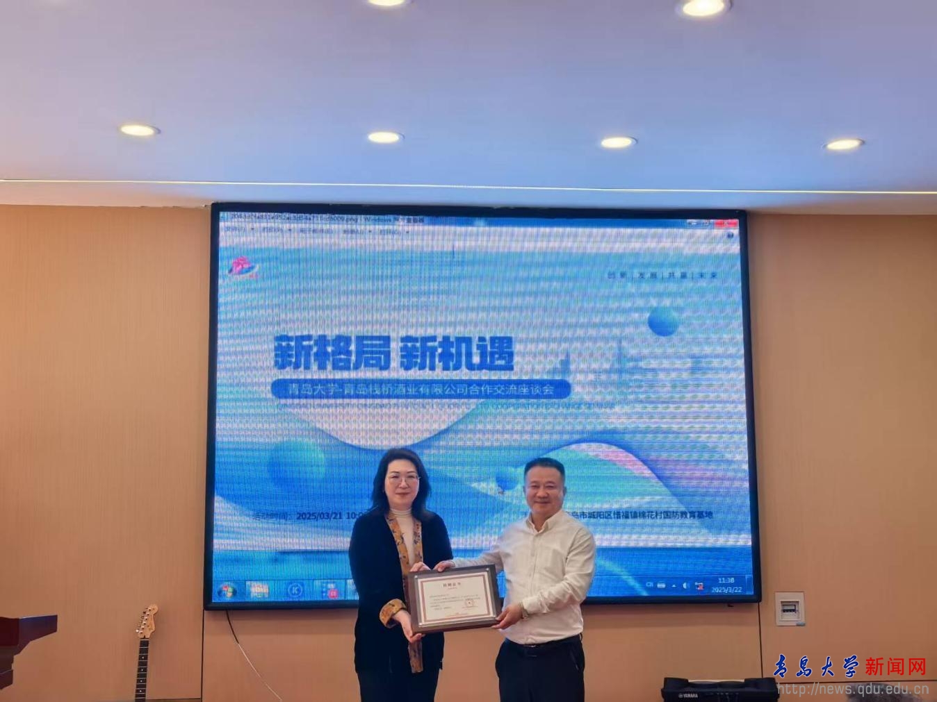 合作发展处处长王海荣与栈桥酒业集团副总经理宋啸峰签署合作协议,根据协议内容,双方将在人才联合培养、科技成果转化、学生就业等方面加强合作。王海荣为刘凤昆颁发捐赠证书。
