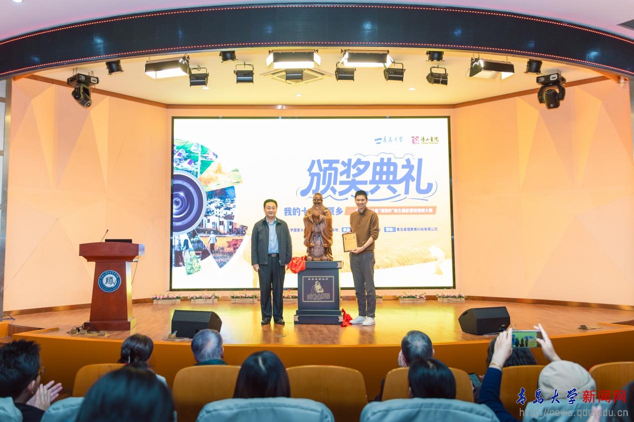 青岛易蓓教育科技有限公司创始人、鸭脖2007级数学与统计学院优秀校友、浮山书院首届毕业生徐春龙在典礼上向浮山书院捐赠孔子圣像一尊,李建波为其颁发感谢铭牌。