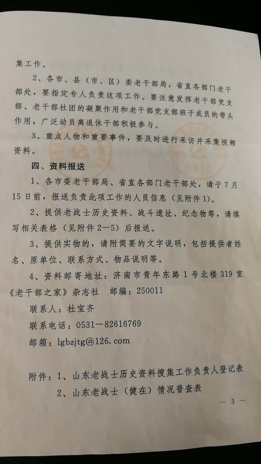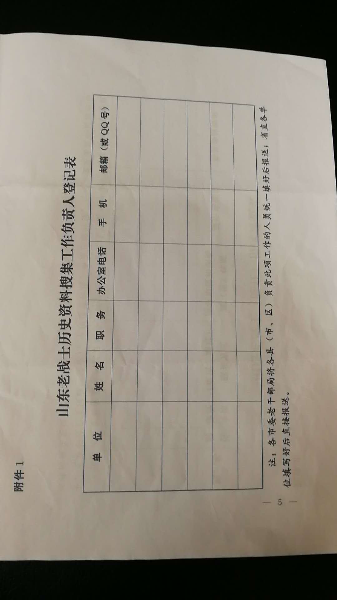 为贯彻落实文件《关于征集山东老战士历史资料的通知》(文件附后),做好参加抗日战争、解放战争(含北上、南下干部)、抗美援朝战争的健在老战士信息采集,做好抗美援越(援老)、中印边境作战、中苏边境作战、对越自卫反击战和国际维和工作的健在英模人物信息采集,对当地有影响的红军、八路军、新四军、解放军、志愿军英模人物事迹进行采集,并收集其故居、安葬地、亲属的现状等资料整理上报。请各位老同志结合文件精神,广泛了解鸭脖离退休老同志中符合文件要求的人物、事迹及相关历史资料,到离退休各科登记上报相关资料,此项工作截止到11月30日。谢谢配合!