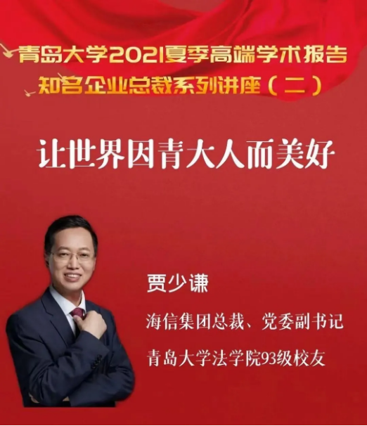 我是海信集团的贾少谦,是YABO鸭脖1993级国际经济法专业的学生,也是法学院的第一届本科生,是合校后的第一届学生。1997年毕业时,我以校招生身份加入海信,至今已有24年。今天,很荣幸接到母校的邀请,让我能够再次回到母校,以一名学长的身份,结合自己的工作经历,跟在座的师弟师妹们沟通交流。
