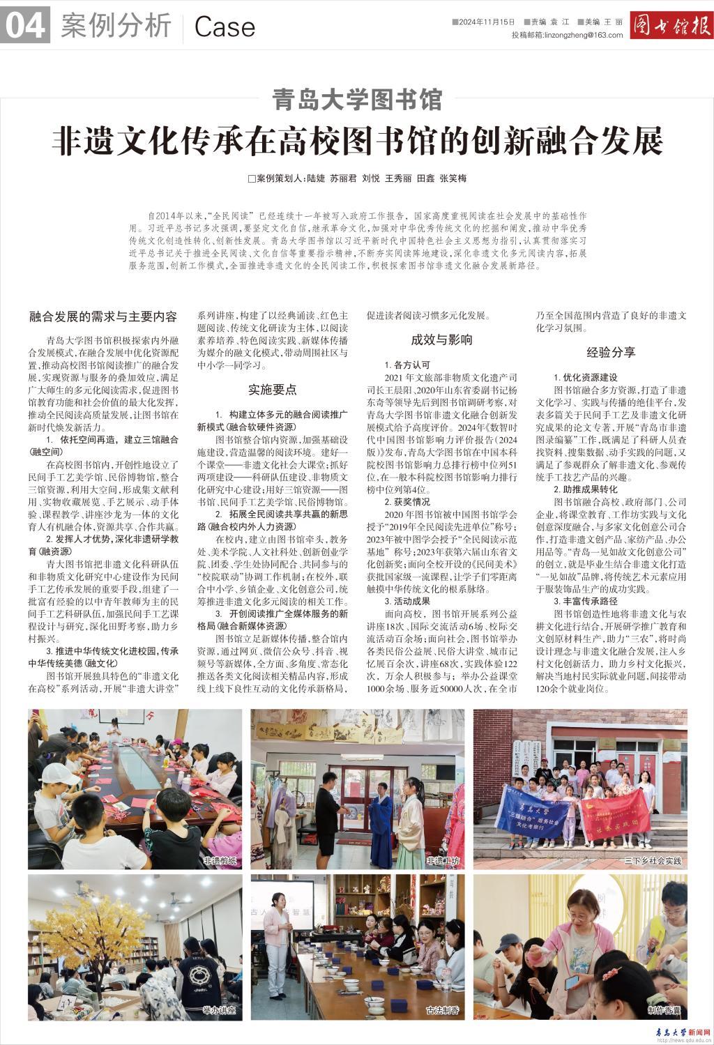 《图书馆报》总第718期第4版整版刊发鸭脖图书馆题为《非遗文化传承在高校图书馆的创新融合发展》的文化创新案例。案例结合近年来鸭脖非遗文化空间建设和传承活动开展情况,融整图书馆、民间手工艺美学馆、民俗博物馆三馆资源,实现空间资源的优化利用(融空间);发挥人才优势,深化非遗研学教育(融资源);推进中华传统文化进校园,传承中华传统美德(融文化)。《图书馆报》是我国图书馆学界第一份也是唯一的一份图书馆行业报纸,于2010年1月1日正式独立发行,已在图书馆界积累了相当高的知名度。