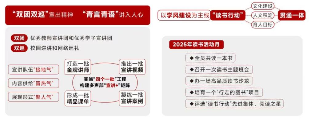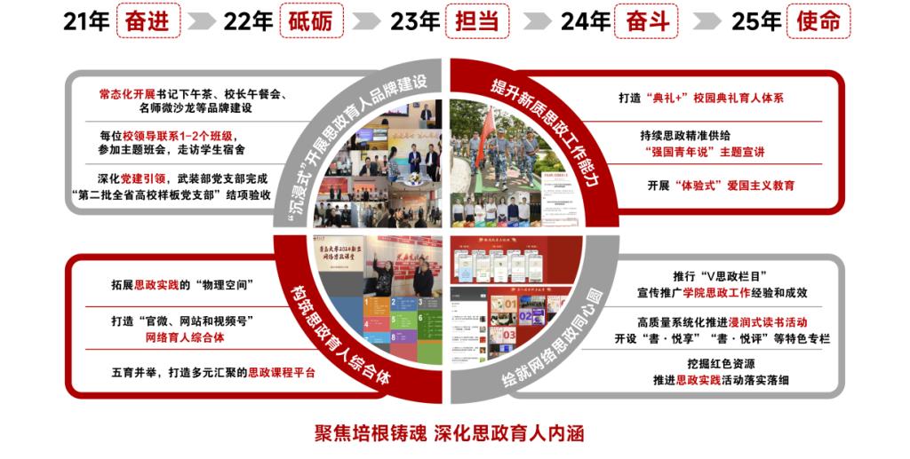 强化思政引领,常态化开展“书记下午茶”“校长午餐会”等学生思政品牌活动,校领导带头讲思政课,累计超150期,在面对面交流中传递思想力量;校领导每人联系1-2个班级,常态化参与主题班会、走访学生宿舍,以“一线工作法”筑牢育人纽带。创新思政教育载体形式,打造“新生网络思政课堂”,迭代至4.0版本,设20个课程模块模块,录制150余节网络思政课程,每年覆盖全体新生。深化“强国青年说”主题宣讲,组建78人青年领航讲师团,通过体系化宣讲、通俗化阐释、故事化解读,把宣讲嵌入到学业指导、典礼仪式、社会实践、志愿服务中,点亮学生信仰灯塔,6项作品获省市级奖项。