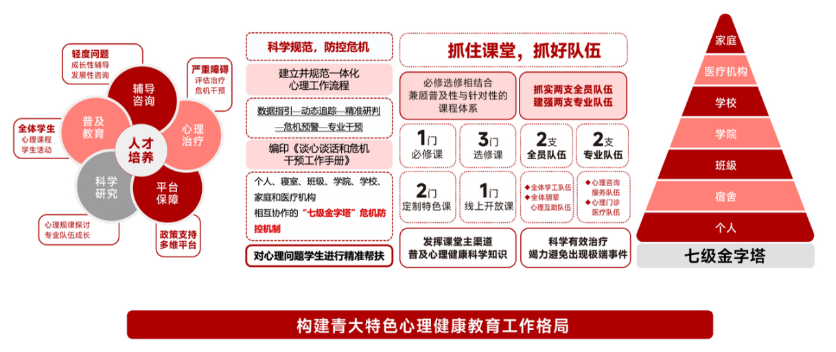 以积极心理学为导向,构建“预防-干预-发展”三位一体心理育人体系,完善“七级金字塔”危机预警和干预机制,成立生命教育研究中心、鸭脖杰正大学生心理干预研究所。精确排查,一年两次全覆盖心理筛查,春季学期覆盖全体学生,秋季学期覆盖全体新生,形成重点群体数据库,“一生一策”精准指导。完善危机响应机制,强化“四协同”:家校协同、咨诊协同、医校协同、校警协同,危机干预日常化、精准化、规范化,全力防控危机事件发生。强化心理服务供给,建设省内高校首家校园心理门诊,坐诊时间扩至8个半天。开展千人大型心理团体辅导。建强队伍,配备11名专职心理教师,师生比实现1:4000,每年培育班级心理委员、宿舍心理信息员近6000人,获评“全国大学生心理健康教育工作先进单位”。