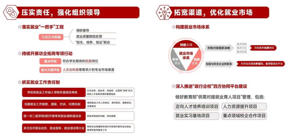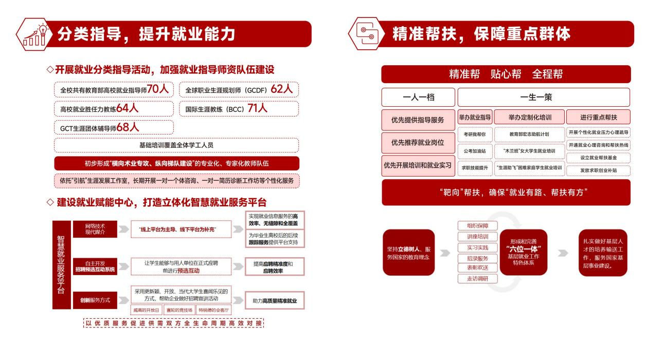 拓宽就业渠道,实施就业“一把手”工程,校院两级领导带头开展访企拓岗专项行动,累计走访企业超1200家,新拓就业岗位1万余个;共建校地就业工作站50个、就业实习“双百基地”134个,立项教育部供需对接就业育人项目79个;每年举办线上线下招聘活动500余场,提供岗位超7万个,毕业生与有效岗位比达1:7。“十四五”期间,鸭脖本科生继续深造率实现连续9年正增长,最高达41.93%,深造质量列省属高校第一。强化分类指导,推广“就业地图”智能系统,相关课程获评全国高校就业创业金课,省级一流本科课程,获评首届《大学生职业发展与就业指导》课程教学赛道全国总决赛银奖,获第二届全国大学生职业规划大赛国赛金奖1项银奖1项;开展就业赋能沙龙35期、就业指导专题活动二百余期。学校就业工作获教育部点名表扬,相关案例入选教育部百大就业创业经典案例。