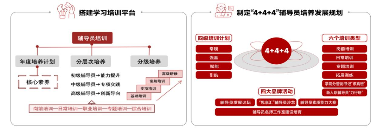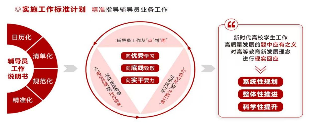 实施“4+4+4”辅导员培养发展规划,构建分层分类精准施训体系。设立学院分管副书记“求真班”、新入职辅导员“力行班”,打造“辅导员发展论坛”“思享汇”等培训品牌,累计组织培训176场,参训1.03万人次,实现全员全覆盖。工作标准化,推行“辅导员工作台账”“工作一览表”“实务手册”,实施日历化台账管理,梳理出全年常规性工作181项,为辅导员业务开展提供精准指引。持续建设6个辅导员工作室,筹办全国辅导员工作室联建活动,吸引27个省份199个工作室参与,逐步构建起跨区域思政育人队伍成长共同体。